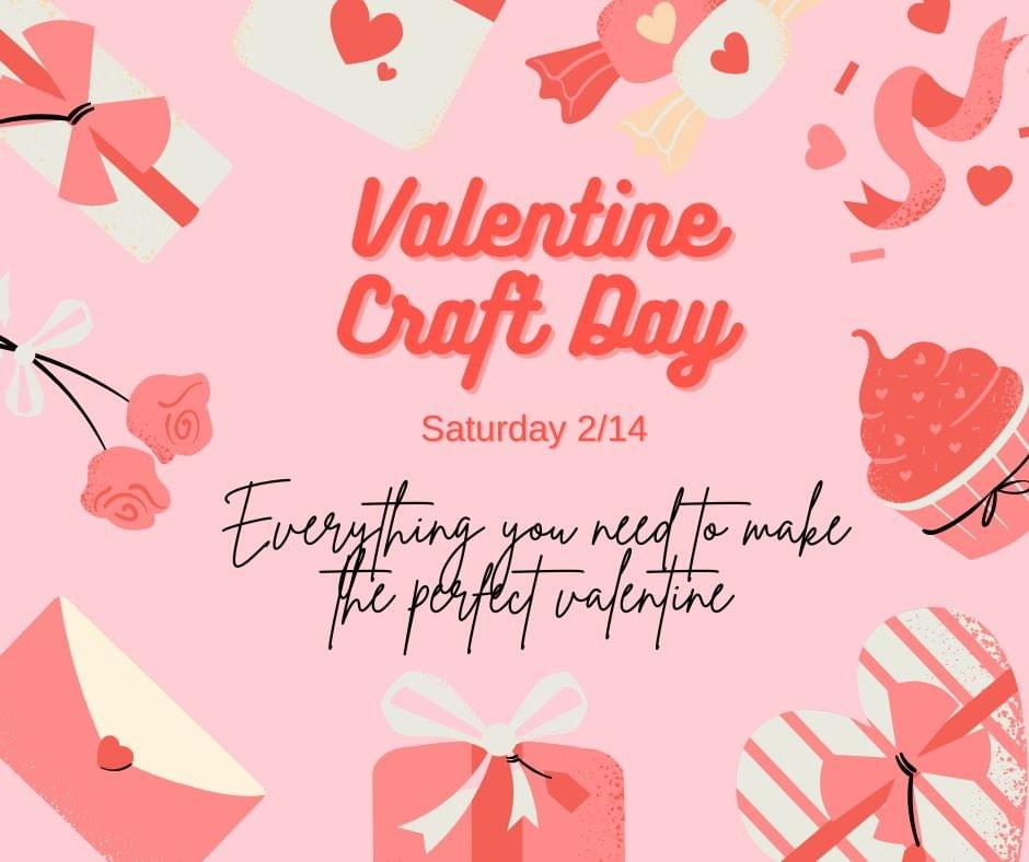 Stop by the library on Saturday, 2/14 for a fun craft day: Everything you need to hand-make a perfect valentine for a special someone! Free Coffee/Tea or Hot cocoa, and we'll even have a family movie screening! (movie TBA)